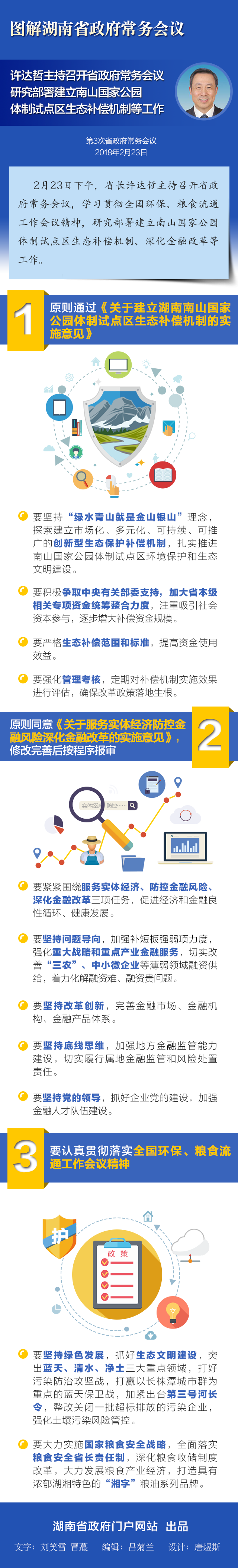 【图解】2月23日湖南省政府常务会议:研究部署建立南山国家公园体制试点区生态补偿机制等工作 发布时间:2018-02-24 10:32 来源:湖南省人民政府门户网站 浏览次数: 次 【字体:小 大】 扫一扫在手机打开当前页 分享到: 打印正文