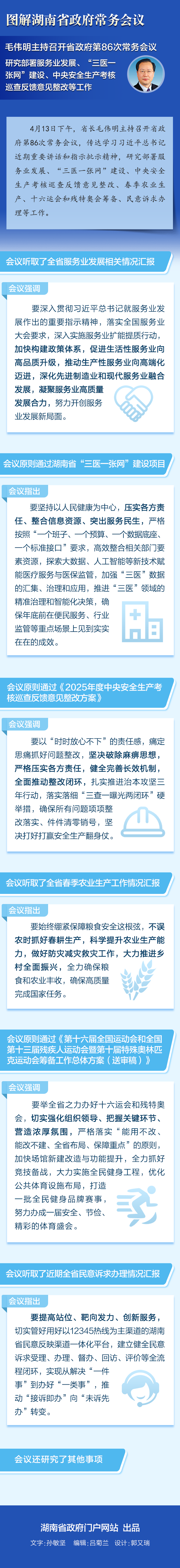 【图解】4月13日省政府常务会议:研究部署服务业发展、“三医一张网”建设、中央安全生产考核巡查反馈意见整改等工作 发布时间:2026-04-14 14:30 来源:湖南省政府门户网站 浏览次数: 次 【字体:小 大】 扫一扫在手机打开当前页 分享到: 打印正文