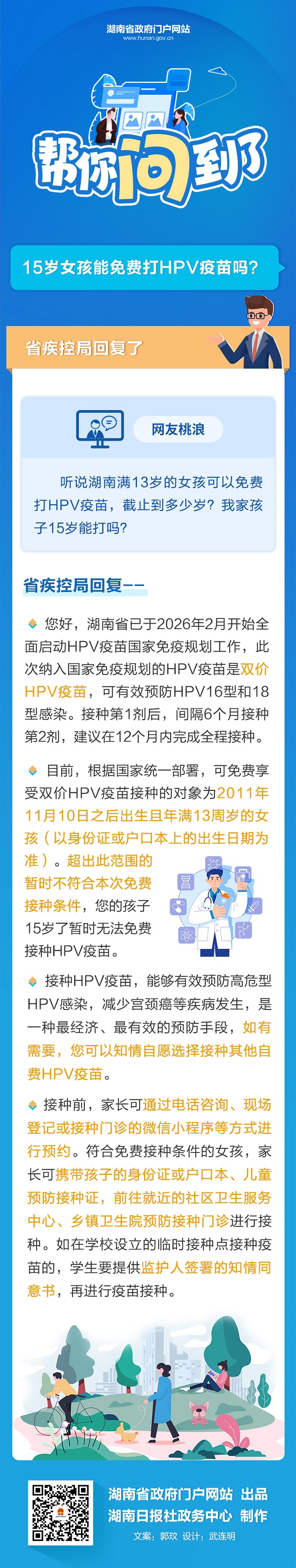 15岁女孩能免费打HPV疫苗吗?帮你问到了