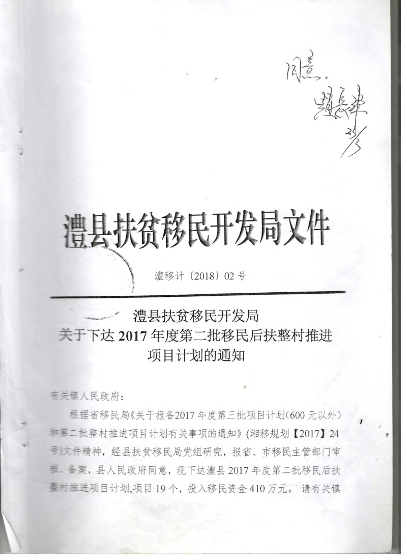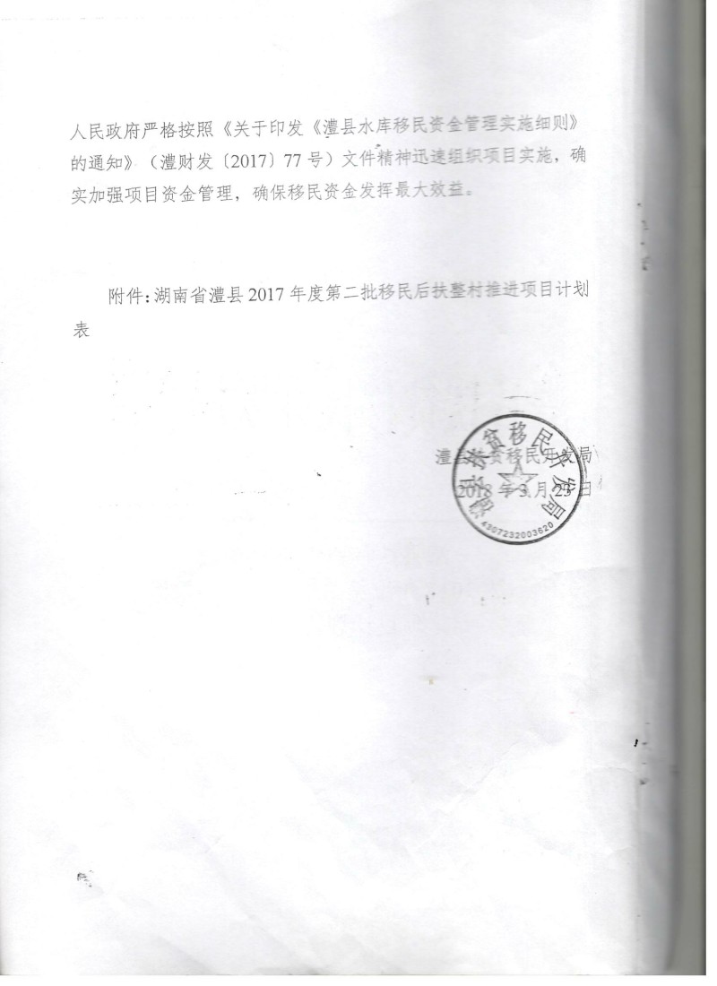 湖南省澧县2017年度第二批移民后扶整村推进项目计划表