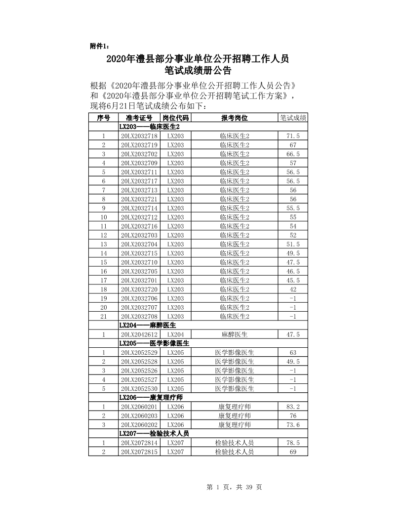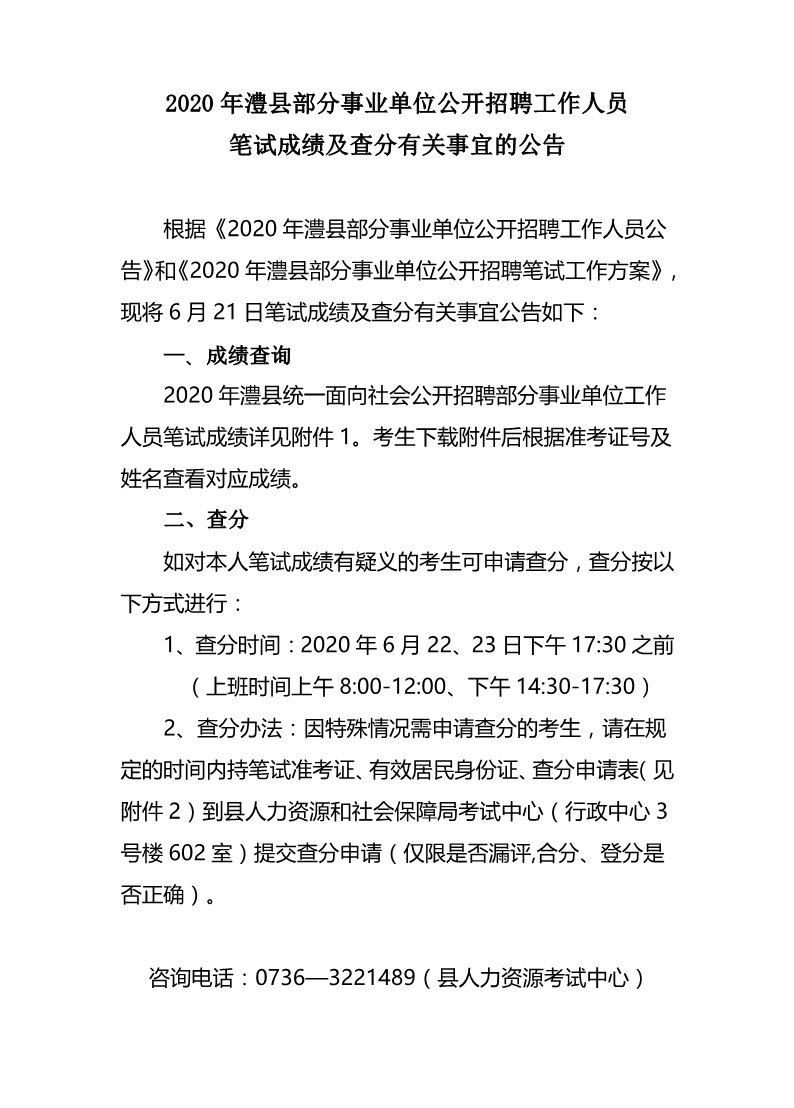2020年澧县部分事业单位公开招聘考试笔试成绩公告