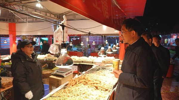 在年货节商品展销区,王启武察看了展位布置、商品供应、食品安全和秩序维护等情况。他一边品尝地方特色美食,一边与商户和工作人员亲切交流,详细了解年货销售、现场客流和服务保障等情况。